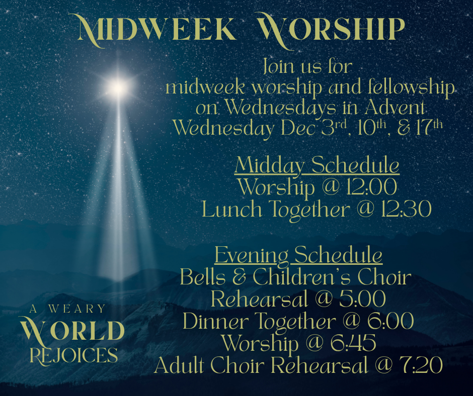 This Advent season, a weary world rejoices as we prepare our hearts for the coming of Christ. Join us for meaningful midweek worship, joyful gatherings, and opportunities to reflect, pray, and celebrate with our community. It’ll be a sacred time for rest and making space for God.