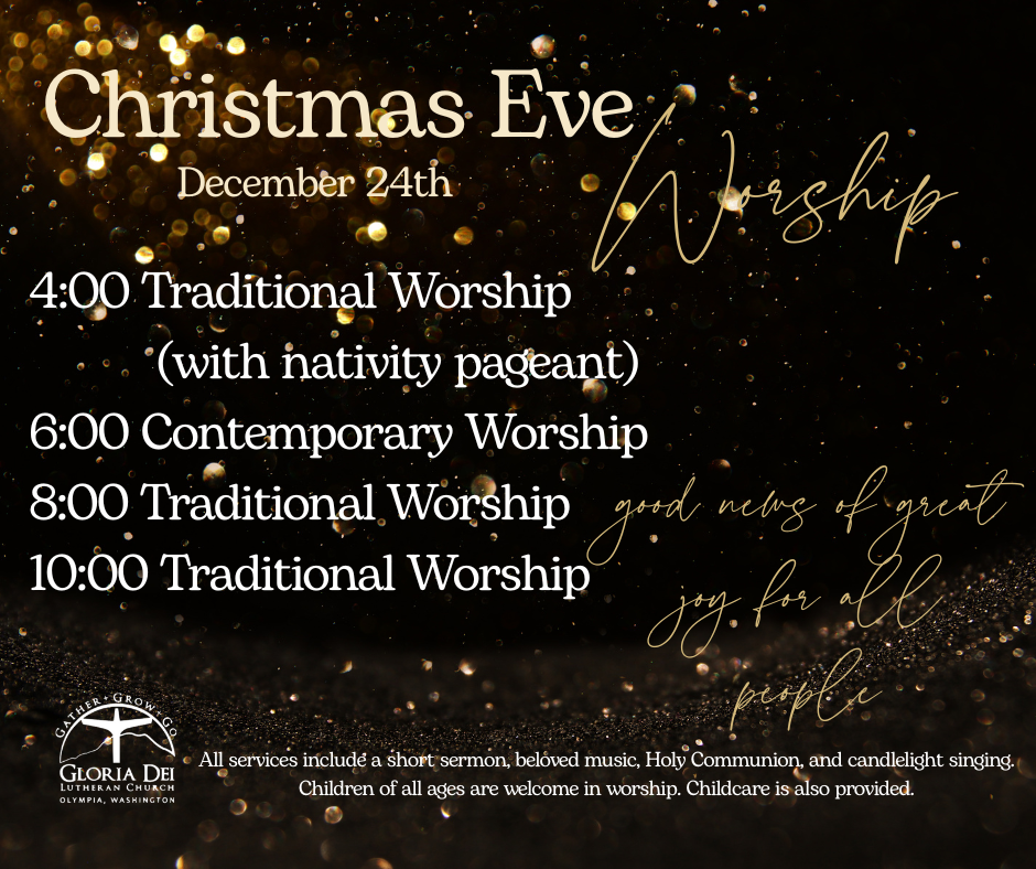 On Christmas Eve, experience the wonder of good news of great joy for all people with candlelight, carols, and the story of Christ’s birth. All services include a short sermon, beloved music, Holy Communion, and candlelight singing. Childcare is also provided.